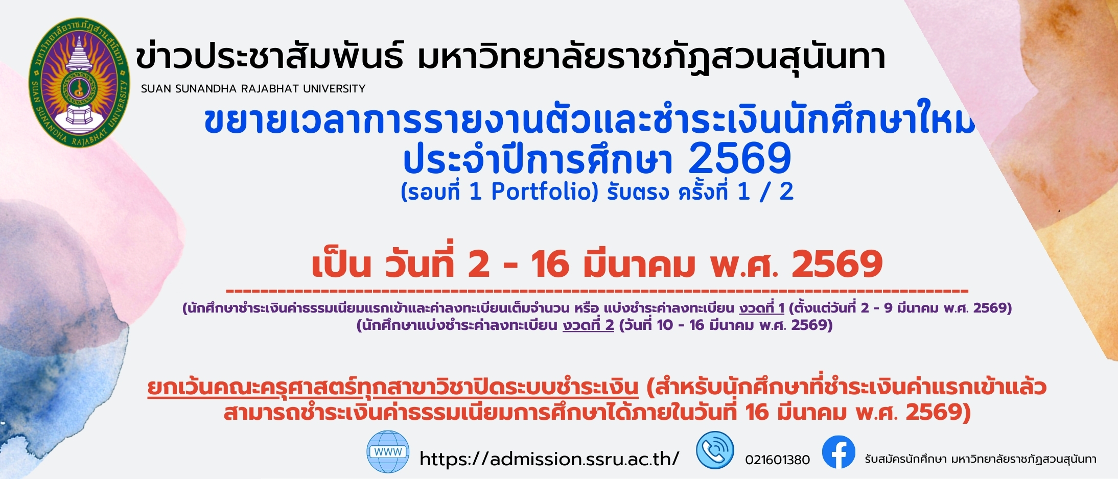ประกาศขยายเวลารายงานตัวนักศึกษา ประจำปีการศึกษา 2569 รอบ Portfolio รับตรง ครั้งที่ 1 - 2