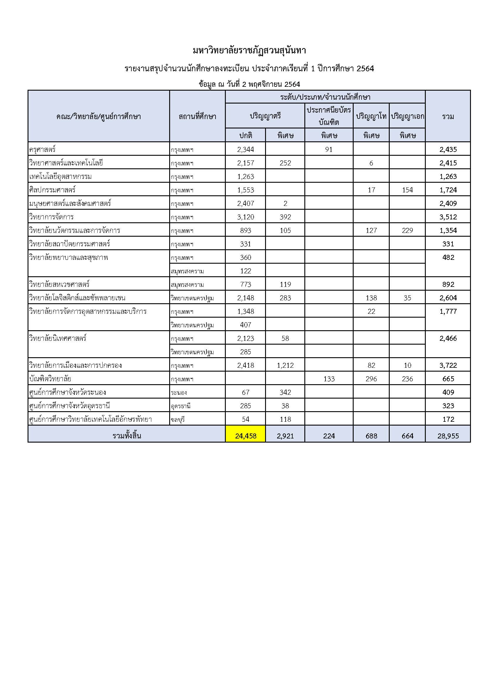 รายงานสรุปจำนวนนักศึกษาลงทะเบียน ประจำภาคเรียนที่ 1 ปีการศึกษา 2564