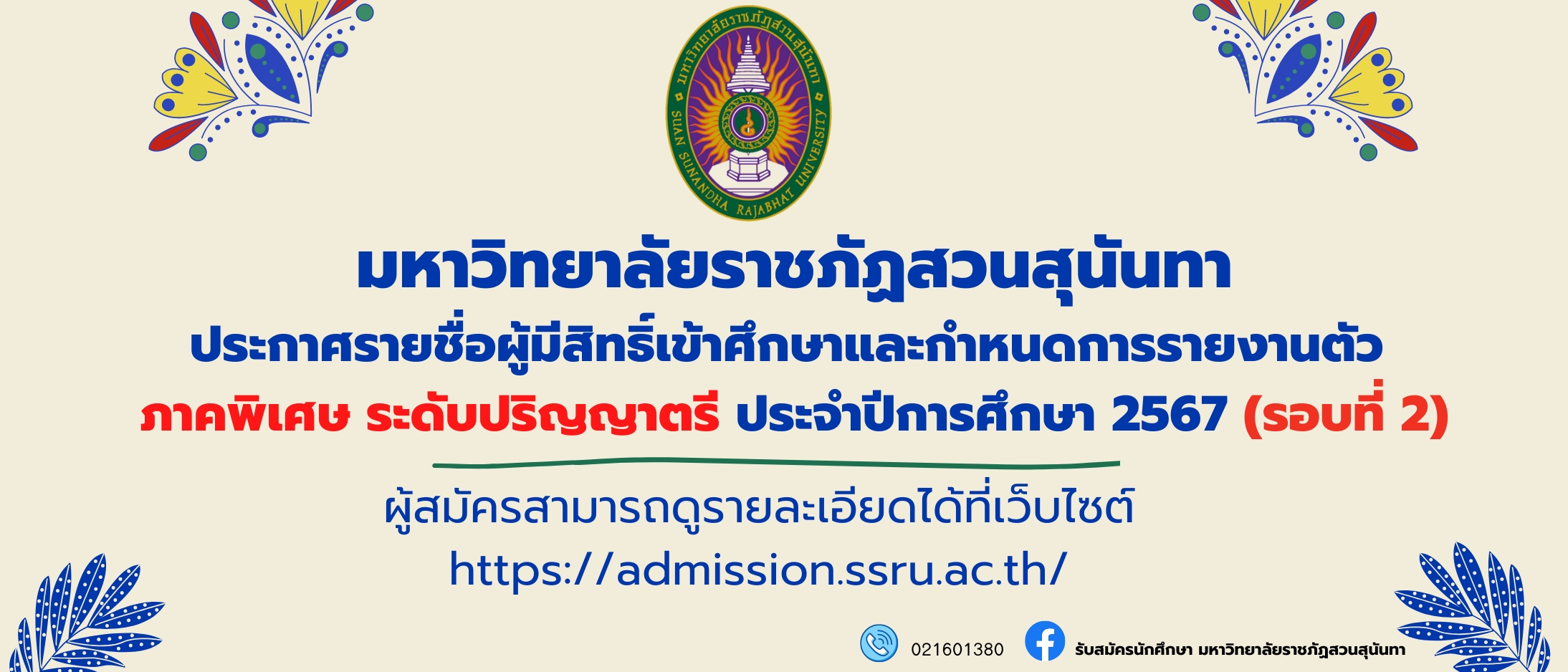 สามารถตรวจสอบรายชื่อได้ที่เว็บไซต์https://admission.ssru.ac.th/