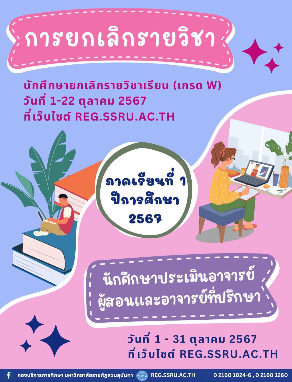 สามารถทำการยกเลิกรายวิชาเรียน ได้ตั้งแต่วันที่ 1-22 ตุลาคม 2567