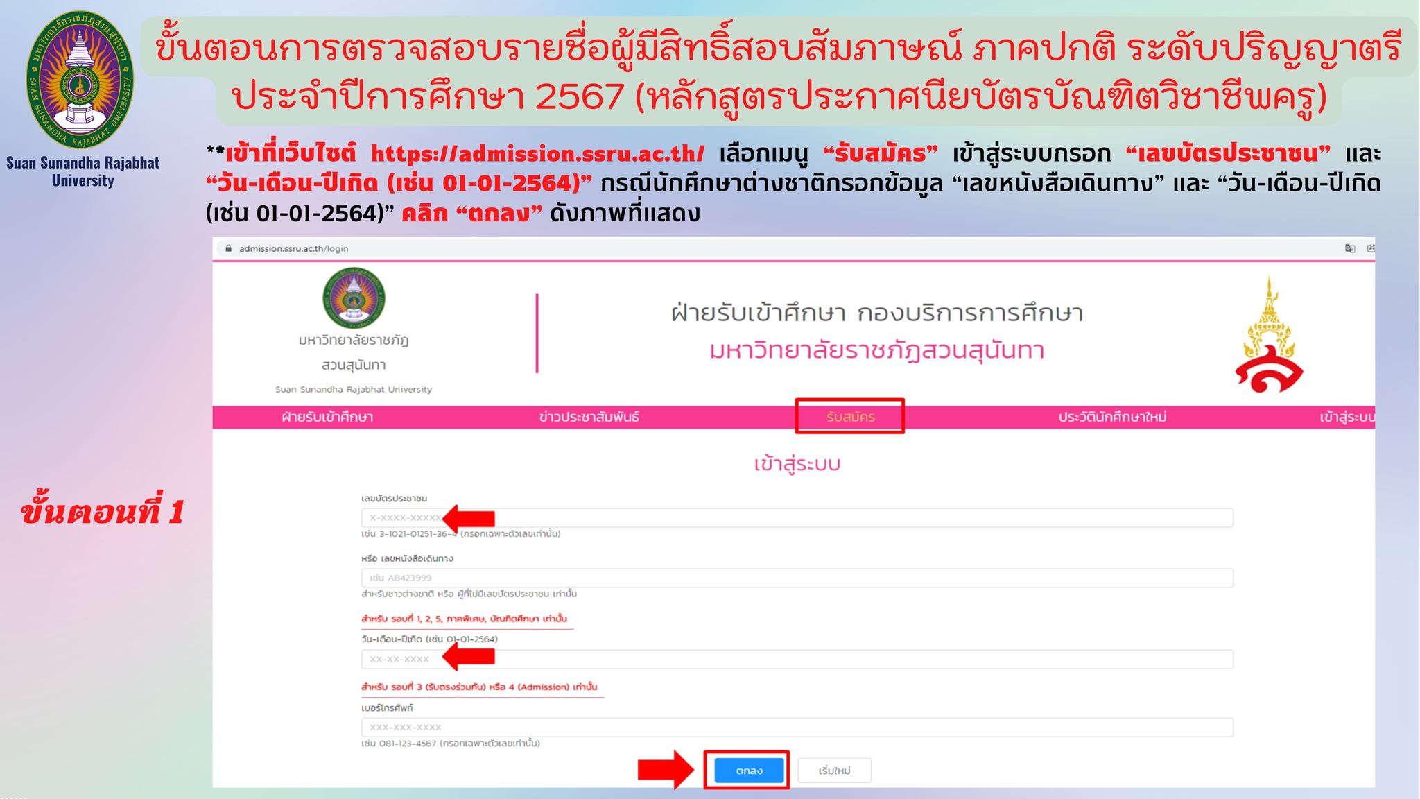 เว็บไซต์ระบบรับสมัครนักศึกษา ==>https://admission.ssru.ac.th/main