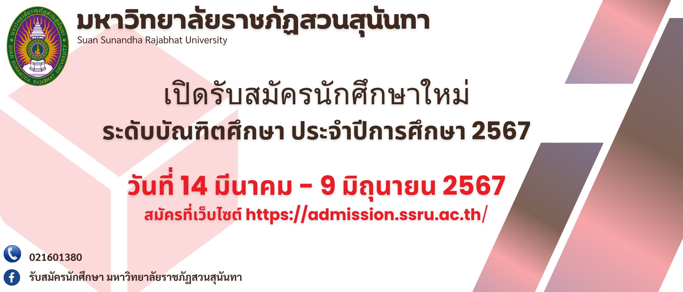 เว็บไซต์ระบบรับสมัครนักศึกษา ==> https://admission.ssru.ac.th/main