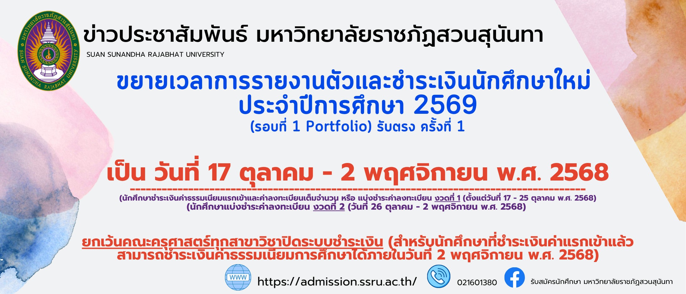 ประกาศขยายเวลารายงานตัวนักศึกษา ประจำปีการศึกษา 2569 รอบ Portfolio รับตรง ครั้งที่ 1