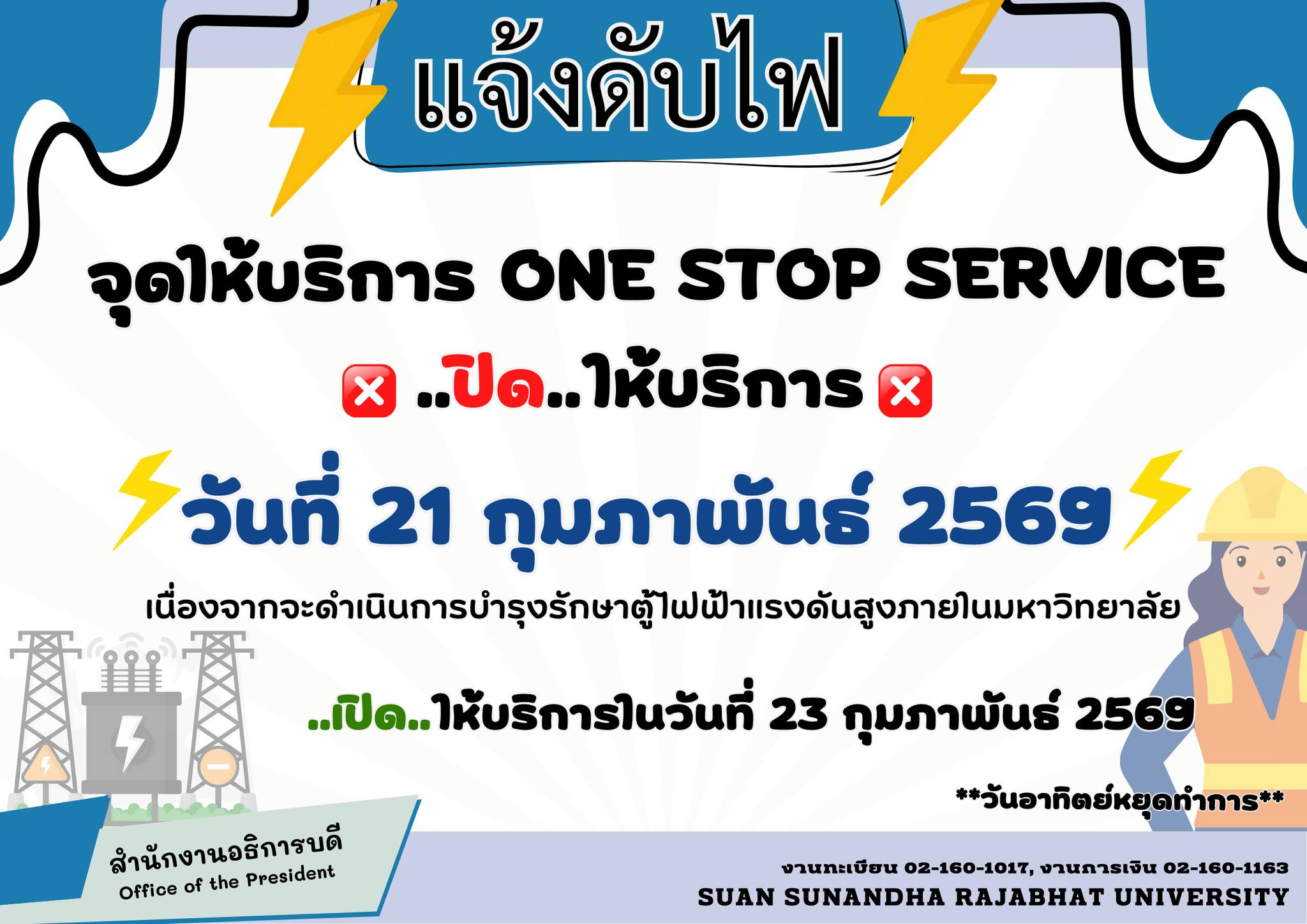 แจ้งปิดให้บริการ One Stop Service วันที่ 21 กุมภาพันธ์ 2569 (ชั้น 1 สำนักงานอธิการบดี)