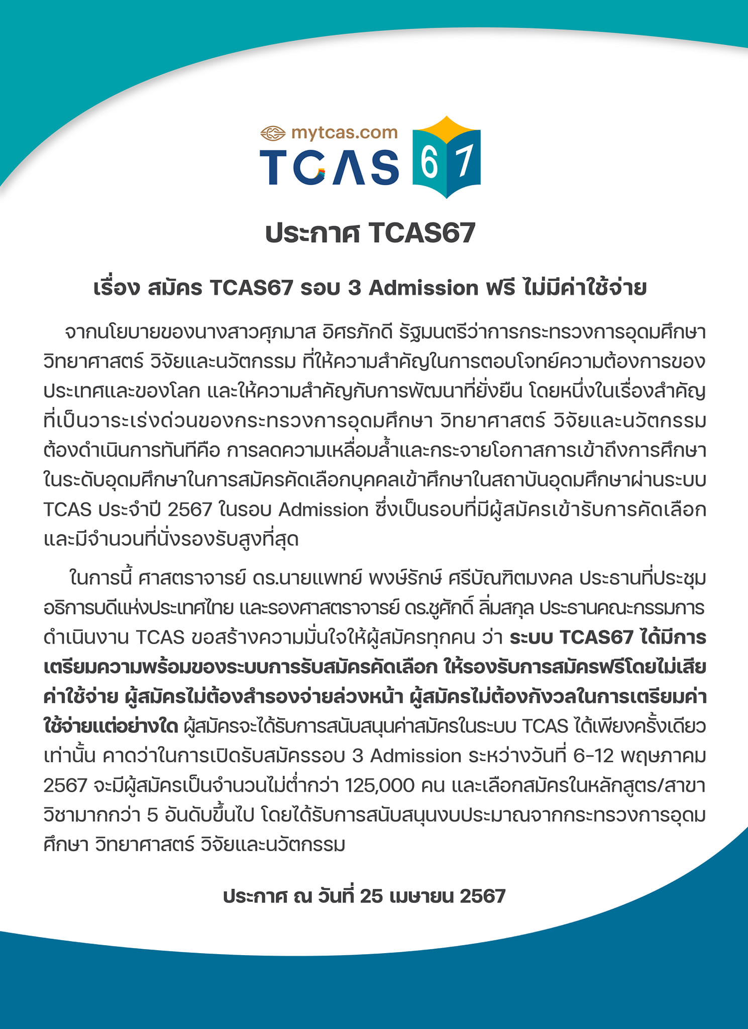 ข่าวสารจากทปอ. ยืนยันแล้ว รอบ 3 Admission TCAS 2567 สมัครสอบฟรี