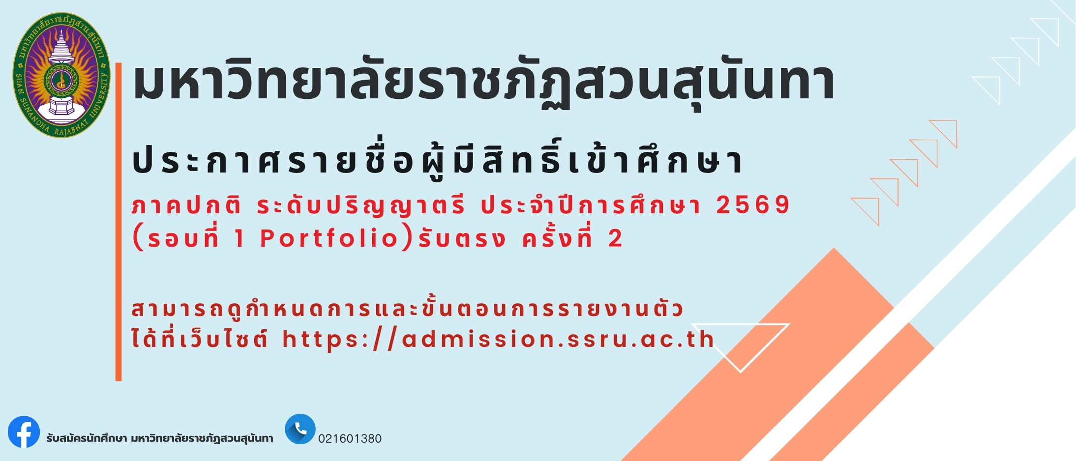 ประกาศรายชื่อผู้มีสิทธิ์เข้าศึกษา รอบที่ 1 Portfolio รับตรง ครั้งที่ 2 ประจำปีการศึกษา 2569